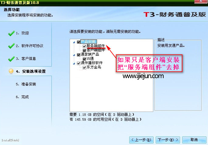 如果只是客戶端安裝要把“服務(wù)端組件”去掉,另外如果是T3用友通客戶端安裝,不需要安裝數(shù)據(jù)庫。